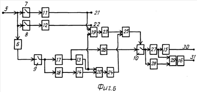 19, 20 – блоки, выполняющие операцию измерения отношений уровней сигналов «после блока 13»/«сигнал 21» и «после блока 13»/«после блока 14» соответственно;