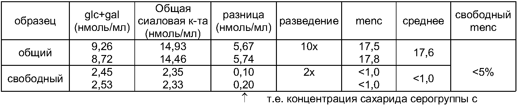 После определения содержания сиаловой кислоты и содержания глюкозы и/или галактозы становится просто сравнить мольные количества каждого моносахарида в смеси, и таким образом вычислить количество капсульных сахаридов в исходной композиции.