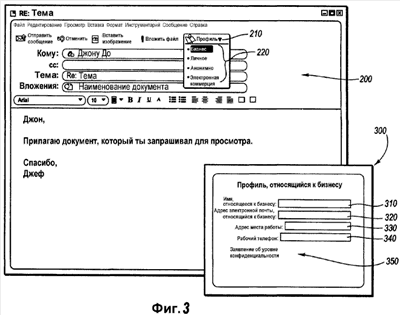 Должно быть понятно, что, поступая таким образом, пользователь может управлять тем, какая информация публикуется и используется приложением. Например, исходящее сообщение будет включать в себя только относящиеся к бизнесу имя и адрес электронной почты пользователя. Подобным же образом, если пользователь должен выбрать для нового сообщения по электронной почте анонимную «персону», то новое исходящее сообщение по электронной почте включало бы в себя анонимные адрес электронной почты и имя, которые не идентифицировали бы отправителя или идентифицировали бы отправителя только некоторым анонимным образом.