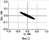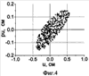 Фиг.4. Поперечный u-pu эмиттанс тестового пучка в аксиальном направлении на выходе из спирального инфлектора, эффективная площадь эмиттанса rms=110 ·мм·мрад.