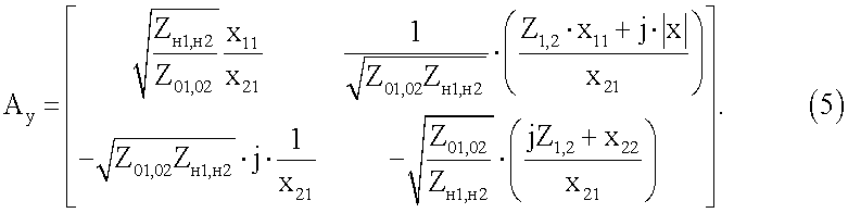 Поскольку элементы матрицы сопротивлений СФУ, записанные с помощью (8) отдельно для двух состояний нелинейного элемента, характеризуют одно и то же СФУ, то взаимосвязи (8) для обоих состояний должны быть попарно равны. Полученная таким образом система двух уравнений не имеет решений. Поэтому необходимо от взаимосвязей между элементами матрицы сопротивлений (8) перейти к взаимосвязям между элементами классической матрицы передачи. Используя соотношения между этими матрицами [Фельдштейн А.Л., Явич Л.Р. Синтез четырехполюсников и восьмиполюсников на СВЧ. М.: Связь, 1971. с.37], получим:
