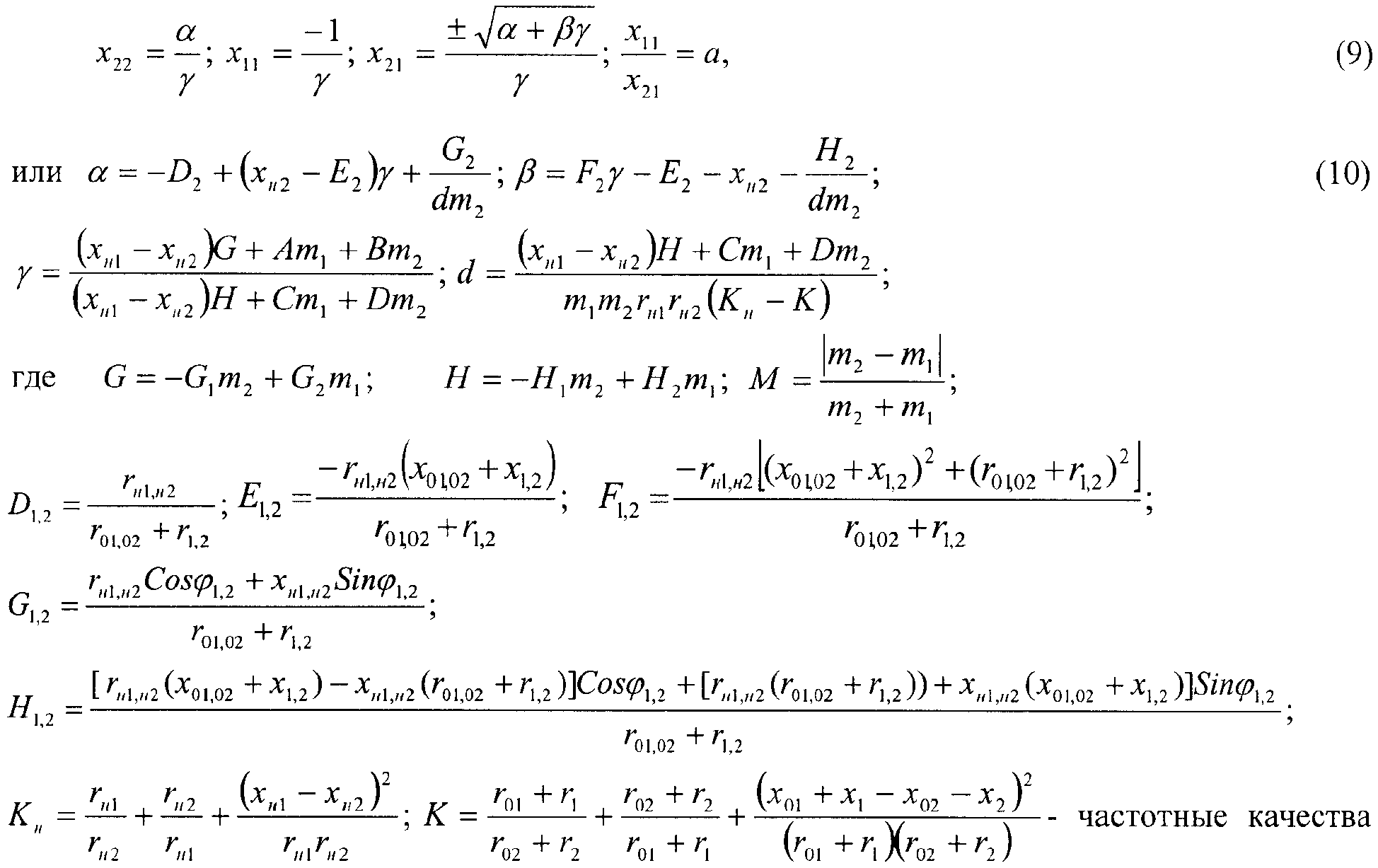 нагрузки и источника сигнала с нелинейным элементом (мера различия их сопротивлений на двух частотах);   a, b, c, d – элементы классической матрицы передачи четырехполюсника; rн1,н2, xн1,н2 – заданные действительные и мнимые составляющие сопротивления нагрузки на двух крайних частотах фазомодулированного сигнала;