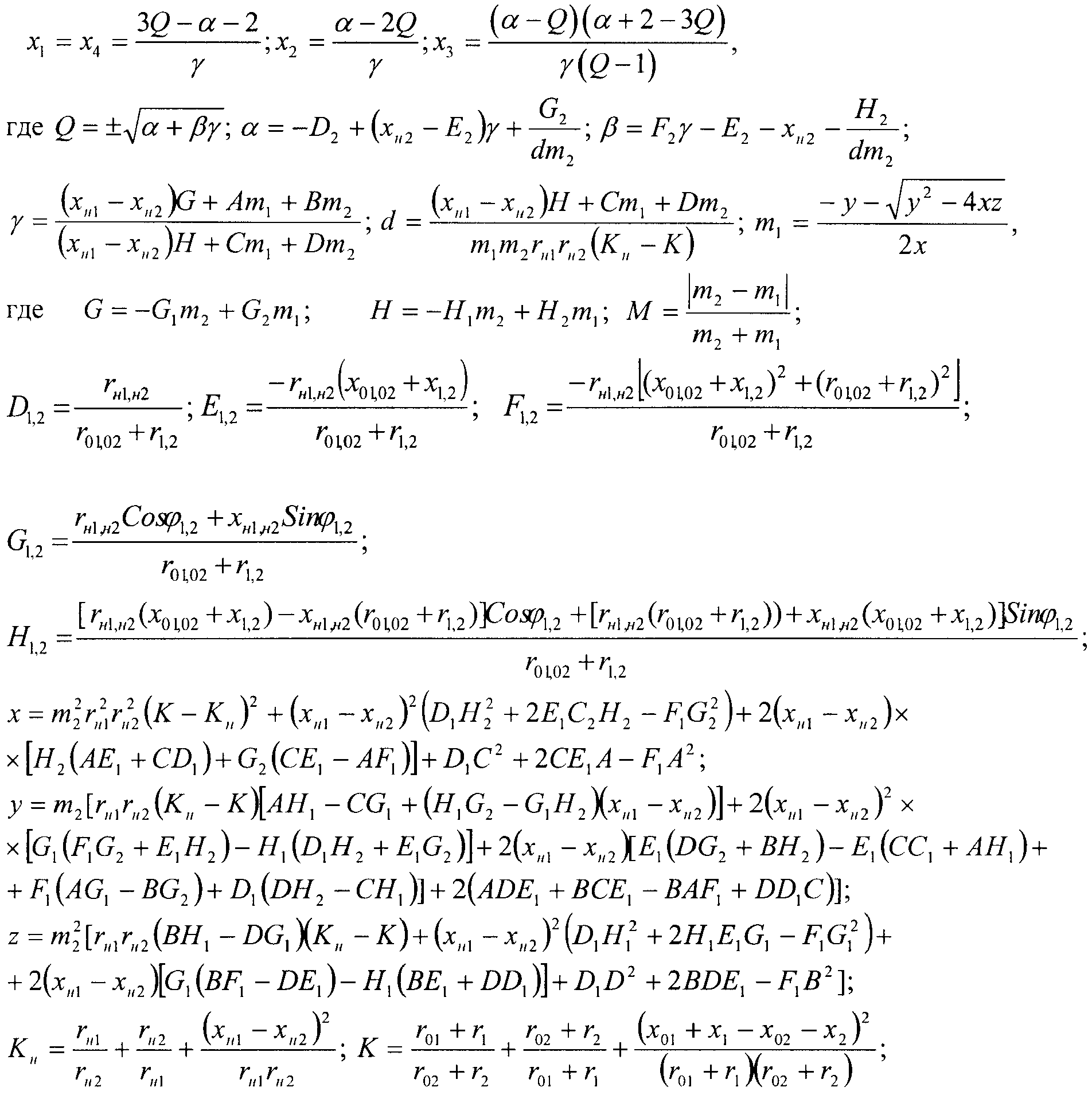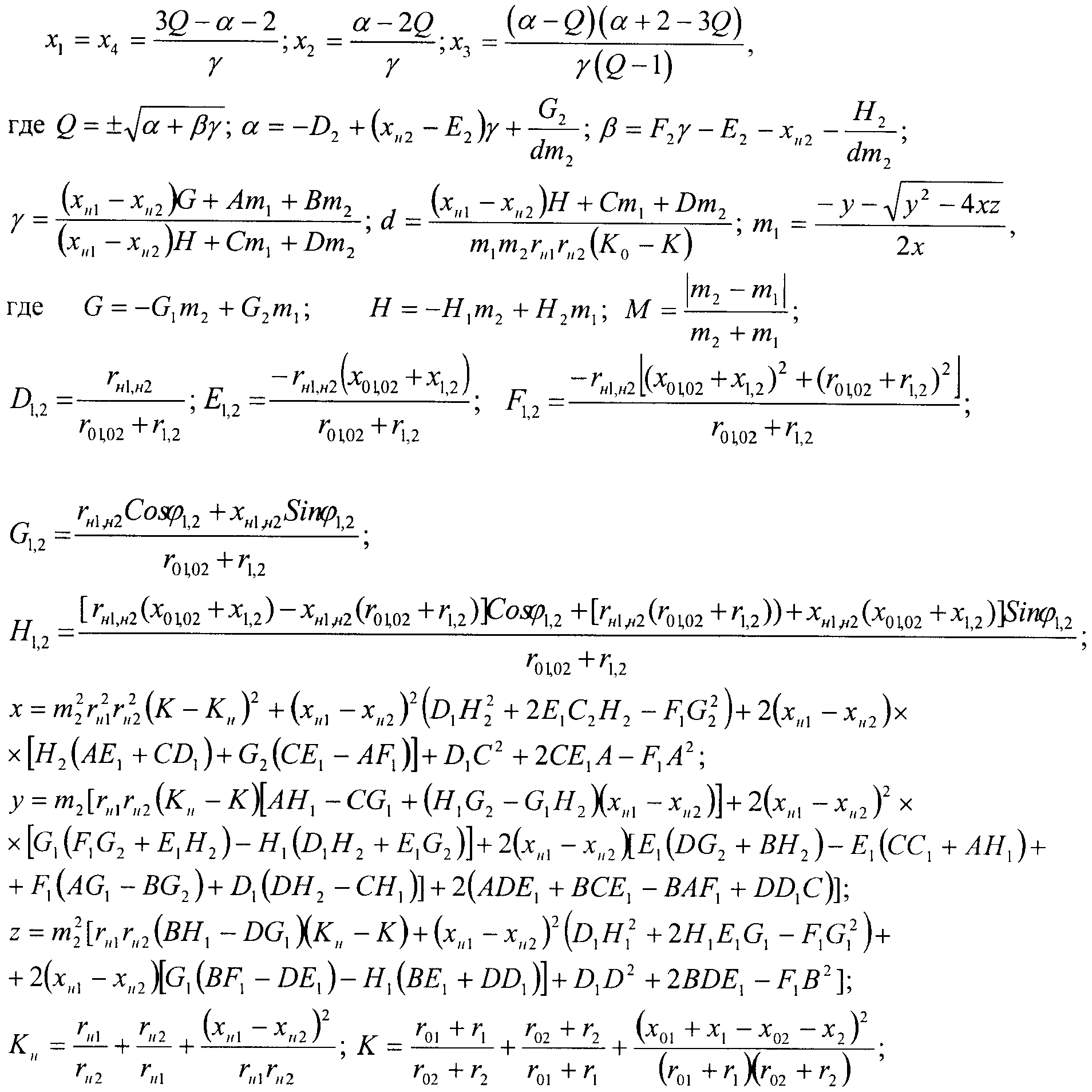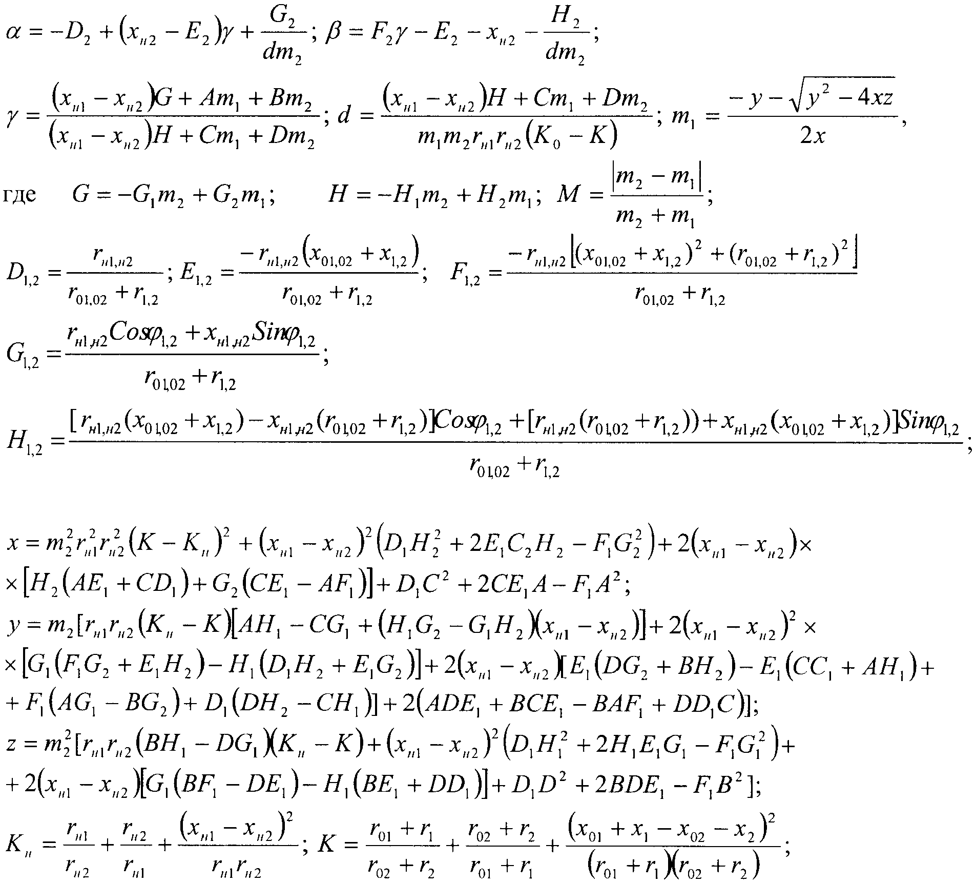 a, b, c, d – элементы классической матрицы передачи четырехполюсника; rн1,н2, xн1,н2 заданные действительные и мнимые составляющие сопротивления нагрузки на двух крайних частотах фазомодулированного сигнала; r01,02, x01,02 – заданные действительные и мнимые составляющие сопротивления источника сигнала на двух крайних частотах фазомодулированного сигнала; r1,2, x1,2 – заданные действительные и мнимые составляющие сопротивления нелинейного элемента на двух крайних частотах фазомодулированного сигнала; M – глубина амплитудной модуляции амплитудно-фазомодулированного сигнала; 1,2 – заданные фазы фазомодулированного сигнала на двух его крайних частотах.