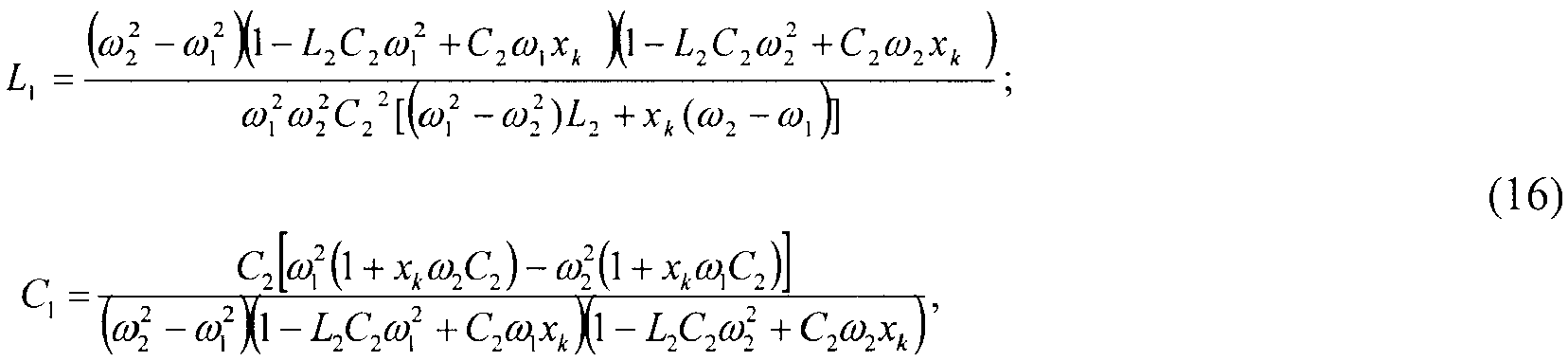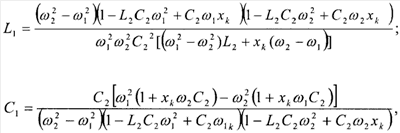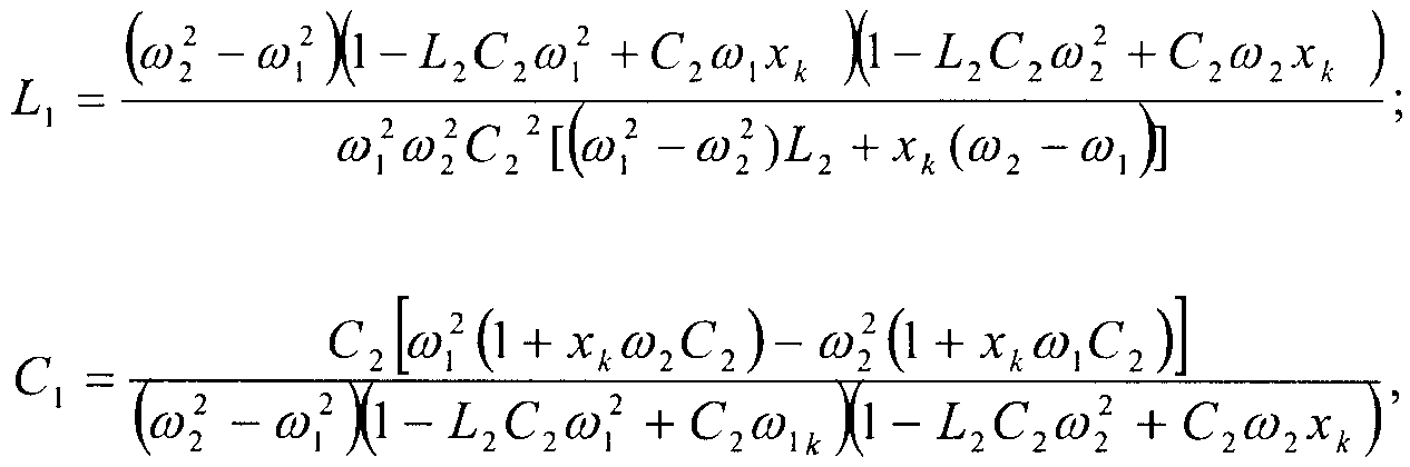 при этом каждый из двухполюсников сформирован из последовательно соединенных между собой параллельного L1, С1 и последовательного L2С2 контуров, причем элементы параллельного контура определяются с помощью следующих математических выражений: