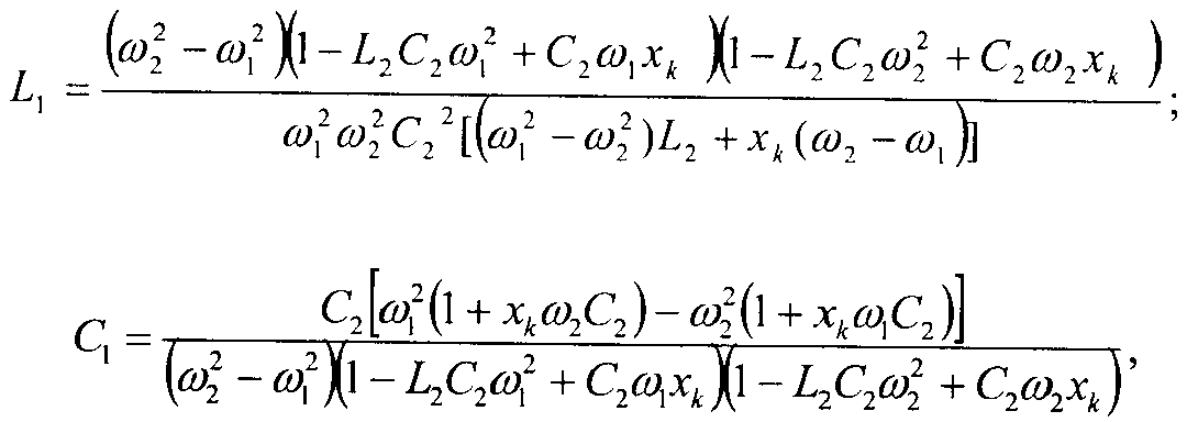 где 1,2=2 f1,2; f1,2 – заданные крайние частоты диапазона изменения частоты фазомодулированного сигнала; L2C2 – значения индуктивности и емкости последовательного контура, заданные из условия обеспечения физической реализуемости значений индуктивности и емкости L1, C1, определяемых по вышеуказанным формулам; xk – это реактивное сопротивление k-го двухполюсника (k=1, 2, 3, 4).