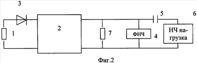 Высокочастотная часть структурной схемы обобщенного предлагаемого устройства по п.2 (фиг.2) состоит из каскадно-соединенных источника ФМС 1, реактивного четырехполюсника 2, двухполюсного нелинейного элемента 3 и высокочастотной нагрузки 7. Низкочастотная часть структурной схемы содержит фильтр нижних частот 4, разделительную емкость 5 и низкочастотную нагрузку 6.