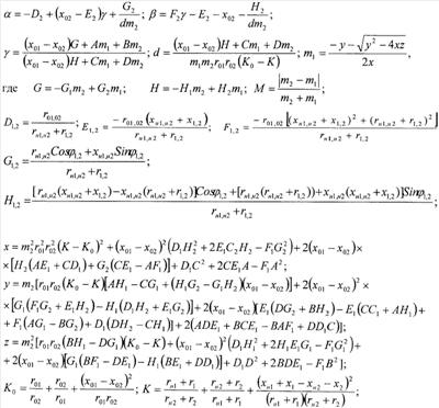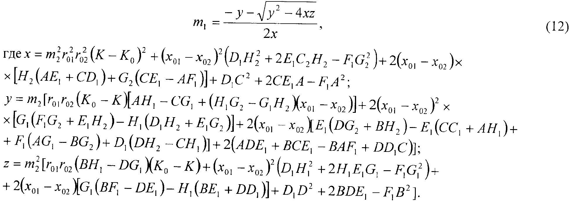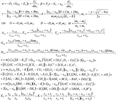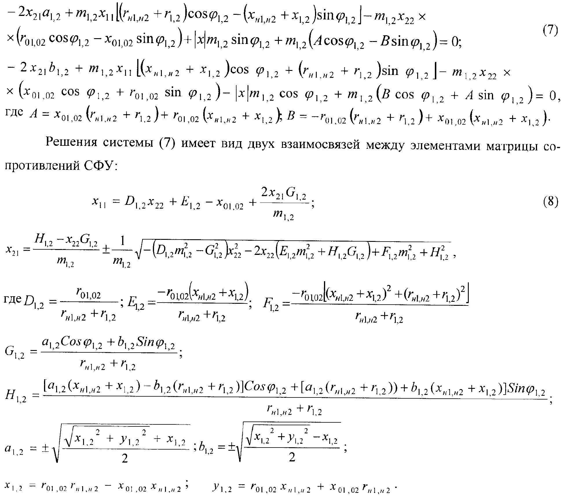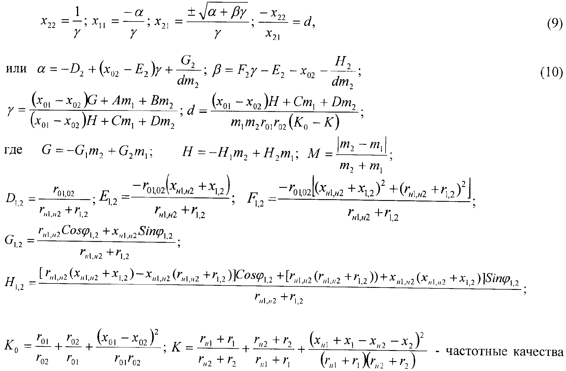 источника сигнала и нелинейного элемента с нагрузкой (мера различия их сопротивлений на двух частотах); ; ; ; a, b, c, d – элементы классической матрицы передачи четырехполюсника; rн1,н2, xн1,н2 – заданные действительные и мнимые составляющие сопротивления нагрузки на двух крайних частотах фазомодулированного сигнала; r01,02, x01,02 – заданные действительные и мнимые составляющие сопротивления источника сигнала на двух крайних частотах фазомодулированного сигнала; r1,2, x1,2 – заданные действительные и мнимые составляющие сопротивления нелинейного элемента на двух крайних частотах фазомодулированного сигнала; М – глубина амплитудной модуляции амплитудно-фазомодулированного сигнала; 1,2 – заданные фазы фазомодулированного сигнала на двух его крайних частотах.