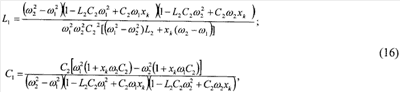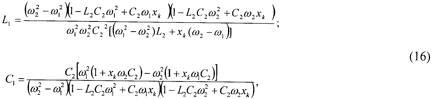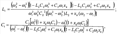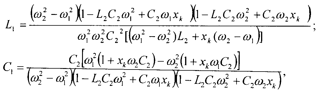 ; ; ; a, b, c, d – элементы классической элементы классической матрицы передачи четырехполюсника; rн1,н2, xн1,н2 – заданные действительные и мнимые составляющие сопротивления нагрузки на двух крайних частотах фазомодулированного сигнала; r01,02, x01,02 – заданные действительные и мнимые составляющие сопротивления источника сигнала на двух крайних частотах фазомодулированного сигнала; r1,2, x1,2 – заданные действительные и мнимые составляющие сопротивления нелинейного элемента на двух крайних частотах фазомодулированного сигнала; M – глубина амплитудной модуляции амплитудно-фазомодулированного сигнала; 1,2 – заданные фазы фазомодулированного сигнала на двух его крайних частотах, при этом каждый из двухполюсников сформирован из последовательно соединенных между собой параллельного L1C1 и последовательного L2C2 контуров, причем элементы параллельного контура определяются с помощью следующих математических выражений: