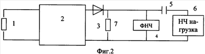 Высокочастотная часть структурной схемы обобщенного предлагаемого устройства по п.2 (фиг.2) состоит из каскадно-соединенных источника ФМС 1, реактивного четырехполюсника 2, двухполюсного нелинейного элемента 3 и высокочастотной нагрузки 7. Низкочастотная часть структурной схемы содержит фильтр нижних частот 4, разделительную емкость 5 и низкочастотную нагрузку 6.