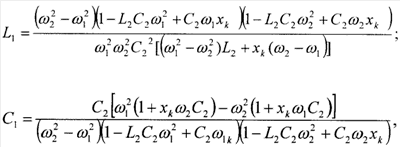 где 1,2=2 f1,2; f1,2 – заданные крайние частоты диапазона изменения частоты фазомодулированного сигнала; L2, C2 – значения индуктивности и емкости последовательного контура, заданные из условия обеспечения физической реализуемости значений индуктивности и емкости L1, C1, определяемых по вышеуказанным формулам; хk – это реактивное сопротивление k-го двухполюсника (k=1, 2, 3).