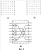 Блок 7 инверторов и перекрестных связей для данного примера представлен на фиг.7, б. Сигналы на выходе блока 7 инверторов и перекрестных связей, для рассматриваемого канала, представлены на фиг.8, а. Далее сигналы поступают на соответствующие первые входы вторых четырех перемножителей. Одновременно с этим по сигналу с пороговой схемы 5 при превышении порога сильным сигналом во входной смеси блок 6 формирования стробов через свои выходы в соответствующие моменты времени передает на перемножители 8 обнуляющие сигналы для обнуления составляющих сильного сигнала. Здесь для «прямого» канала обнуляются следующие позиции составляющих: первая, вторая, пятая, одиннадцатая, двенадцатая, четырнадцатая (фиг.7, а), а для «зеркального» канала следующие позиции: одиннадцатая, двенадцатая, четырнадцатая, шестнадцатая, семнадцатая, двадцатая (фиг.8, а). Следует отметить, что после пятнадцатой позиции, для «прямого» канала, обнуление составляющих сильного сигнала не имеет смысла, поскольку они компенсируются в первом сумматоре 9 восстанавливающем, а для «зеркального» (введенного) канала – с первой по пятой позиции, так как они компенсируются во втором сумматоре 9 восстанавливающем.