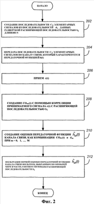 0 n N, где N является длиною расширяющей последовательности Si. 34. Устройство по п.33, в котором параметр L выбирается так, чтобы длительность передаточной функции h(t) канала связи была меньше, чем LTс. 35. Устройство по п.33, в котором параметр L выбирается так, чтобы длительность передаточной функции h(t) канала связи приблизительно равнялась LTc. 36. Устройство по п.30, в котором N меньше чем 20. 37. Устройство для оценки передаточной функции h(t) канала связи, содержащее: средство для генерирования последовательности di данных, имеющей связанную часть Cdi, ассоциированную с, по меньшей мере, двумя кодами w0, w1, причем корреляционная функция Acode(k) связанной части Cdi с одним из двух кодов w0, w1 характеризуется максимальным значением при k=0 и меньшим, чем максимальное значение, при k 0; средство для генерирования последовательности cj элементарных сигналов, имеющей период Тc элементарных сигналов, в виде последовательности di данных, развернутой расширяющей последовательностью Si длиною N; коррелятор для генерирования сигнала com(t)=co(t+mNTc) при m=0, 1, , М с помощью корреляции принимаемого сигнала r(t) с расширяющей последовательностью Si, где принимаемый сигнал r(t) содержит последовательность cj элементарных сигналов, использованную для упомянутого канала связи; и блок оценки для генерирования оценки передаточной функции канала связи, как комбинации com(t) и dm при m=0, 1, , М. 38. Устройство по п.37, в котором блок оценки содержит средство для вычисления , как  39. Устройство по п.38, в котором, по меньшей мере, два кода w0, w1 имеют два символа в длину и где M=2. 40. Устройство по п.37, в котором последовательность di данных включает в себя заголовок, имеющий псевдослучайный код, включающий в себя связанную часть последовательности di данных. 41. Устройство по п.37, в котором Acode(k)=1 при k=0 и Acode(k)=0 для всех k 0. 42. Устройство по п.37, в котором Acode(k)=0 при 0<|k| J, где J выбирается для минимизации корреляции связанной части Cdi с одним из кодов w0, w1 для всех k 0. 43. Устройство по п.42, в котором 2J является длиною связанной части Cdi. 44. Устройство по п.37 в котором Acode(k)=1 при k=0 и Acode(k)=0 для всех k 0. 45. Устройство по п.37, в котором каждый из двух кодов w0, w1 содержит два символа. 46. Устройство по п.37, в котором каждый из двух кодов w0, w1 состоит из двух символов. 47. Устройство по п.37, в котором коды w0, w1 содержат коды Уолша. 48. Устройство по п.37, дополнительно содержащее шаг фильтрации оцененной передаточной функции канала связи фильтром f, выбранном, по меньшей мере, в части, соответствующим расширяющей последовательности Si. 49. Устройство по п.48, в котором фильтр f дополнительно выбирается, по меньшей мере, в части, соответствующим автокорреляционной функции А(n) расширяющей последовательности Si. 50. Устройство по п.49, в котором фильтр f дополнительно выбирается, по меньшей мере, в части, соответствующим длительности передаточной функции h(t) канала связи. 51. Устройство по п.49, в котором фильтр f дополнительно выбирается, по меньшей мере, в части, соответствующим критерию нулевого воздействия -L n L, где f(i) является такой передаточной функцией фильтра f, что Af(n) является сверткой А(n) и f(i); Af(n)=1 при n=0 и Af(n)=0 при 0<|n| L; и