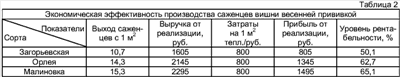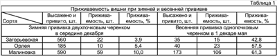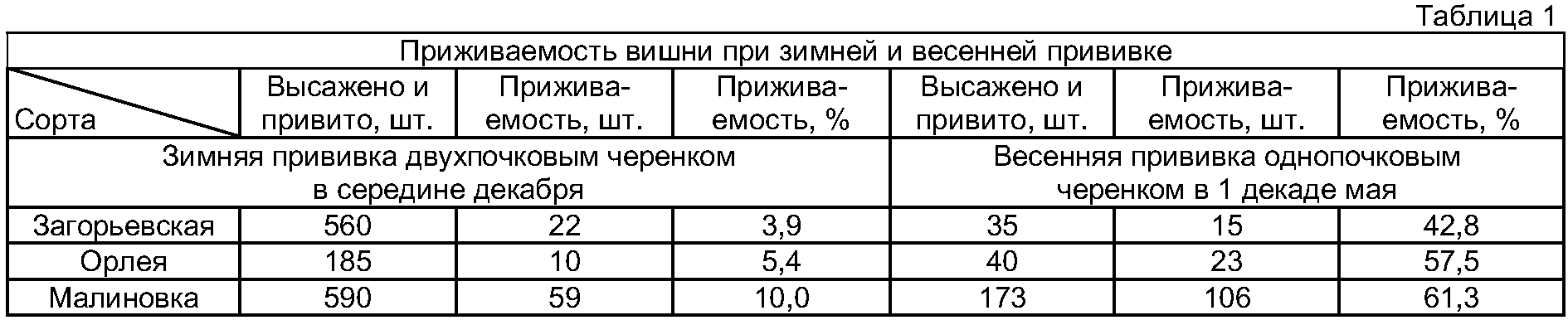 Известен способ зимней прививки вишни, когда прививка выполняется в зимние сроки (во второй или третьей декаде декабря) двухпочковыми черенками привоя на семенной подвой вишни с обрезкой надземной части подвоя (Колесникова А.Ф. Вишня / А.Ф.Колесникова, А.И.Колесников, В.Г.Муханин. – М.: Агропромиздат, 1986, 238 с. – «Выращивание саженцев с использованием зимней прививки» – С. 148-164). Недостатком способа является излишний расход привойного материала вишни, обязательная стратификация прививок в теплом помещении в декабре, низкая приживаемость прививок при данном способе размножения. Известен способ весенней прививки косточковых культур, когда прививка выполняется прорастающим глазком или черенком на подвой косточковых культур рано весной – в апреле и мае. Недостатком является плохая приживаемость глазков, недостаточное сокодвижение в коре (Прототип: Еремин, Г.В. Слива / Г.В.Еремин, В.Л.Витковский. – М.: Колос, 1980, 255 с. – «Прививка» – С. 185.). Задачей, на решение которой направлено заявляемое изобретение, является увеличение эффективности способа за счет увеличения приживаемости и выхода посадочного материала при использовании способа весенней прививки вишни улучшенной копулировкой, включающей прививку черенка привоя на сеянец подвоя вишни с обрезкой надземной части подвоя, при котором прививка выполняется однопочковым черенком в поздневесенние сроки в первой декаде мая. Опыты по внедрению способа были осуществлены в 2006-2007 гг. в ОАО «Плодопитомник» Лысковского района Нижегородской области. Результаты представлены в таблице. Зимняя прививка вишни выполняется в середине декабря в теплом помещении при температуре 18-20°С способом улучшенной копулировки. Далее прививки стратифицируют при температуре 22-25°С в течение 3 недель, пока они не срастутся. В дальнейшем до высадки в поле их хранят в ящиках при температуре 0°С. Этот способ требует больших затрат ручного труда и наличия специализированных помещений. Предлагаемая авторами весенняя прививка вишни выполняется в 1 декаде мая, не требует стратификации прививок, выполняется тем же способом, что и зимняя. Прививки высаживаются в пакеты сразу после выполнения, срастаются и в дальнейшем растут прямо в теплице. Существенное отличие предлагаемого авторами способа в том, что в качестве привоя берется однопочковый черенок, срок прививки переносится на 1 декаду мая, существенно экономятся материальные затраты. Как видно из таблицы, приживаемость прививок в среднем при зимней прививке составила 6,4% по трем сортам вишни, при весенней прививке средняя приживаемость по трем сортам составила 53,9%, что на 47,5% выше, чем при зимней прививке. Это свидетельствует о высоком выходе саженцев и хорошей приживаемости вишни при весенней прививке, что обеспечивает высокую эффективность способа. Выход саженцев при весенней прививке взят от процента приживаемости от 42,8 до 61,3 при 100% выходе саженцев с 1 м2 в 25 штук, т.е. при выходе прививок 42,8% с 1 м2 получаем выход 10,7 штук (привито было 25 штук). Выручку от реализации считаем при цене реализации 150 руб./саженец. Затраты считаем по фактически сложившемуся исходу из общей площади теплицы (1500 м2) с вычленением затрат на 1 м2. При этом отмечаем, что уровень рентабельности у сортов вишни Орлея, Малиновка несколько выше, чем у Загорьевской. Достигнутая экономическая эффе