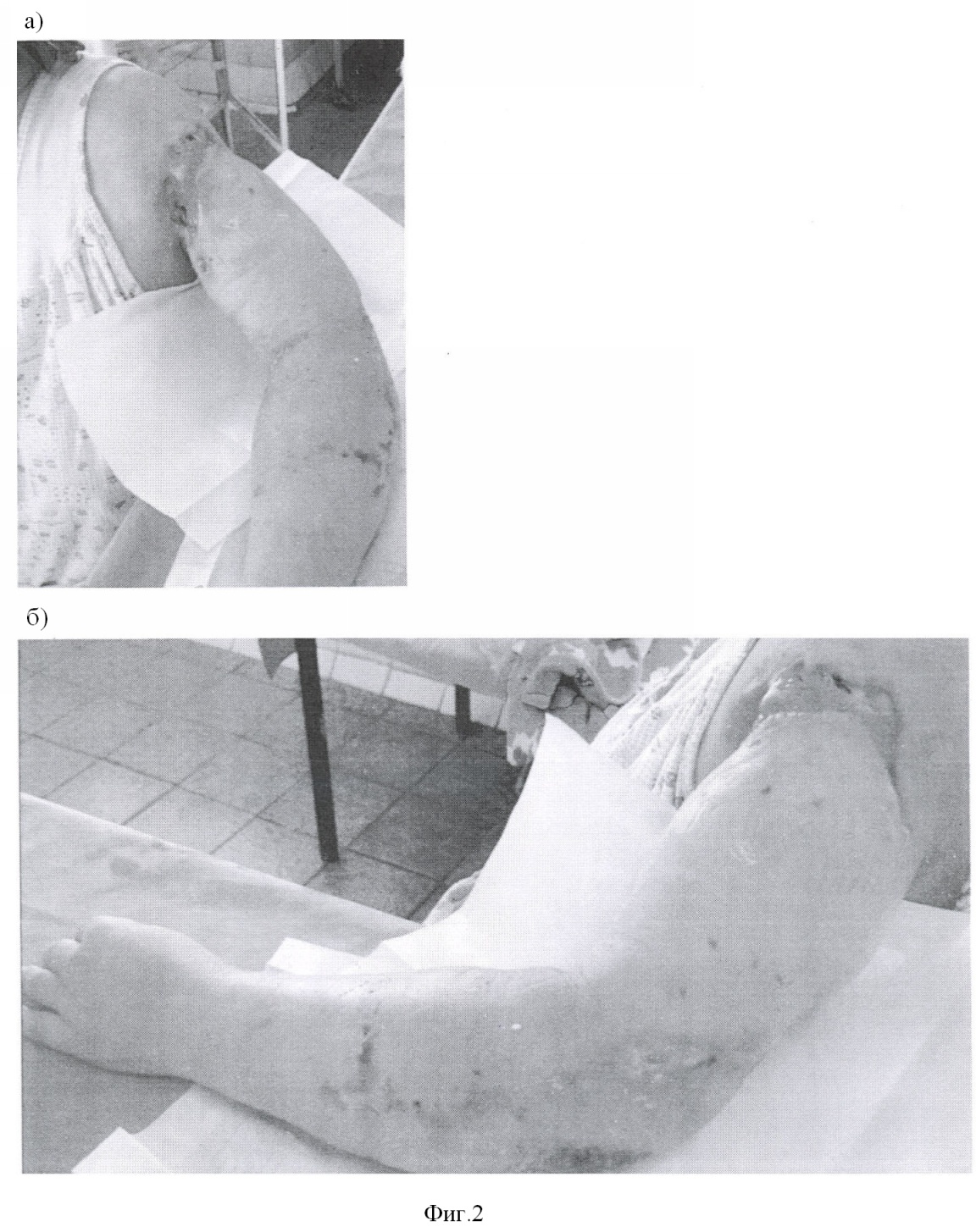 На фиг.2 представлены: а) вид ран спереди на 19-е сутки после вторичной хирургической обработки, (б) вид ран спереди на 19-е сутки после вторичной хирургической обработки.
