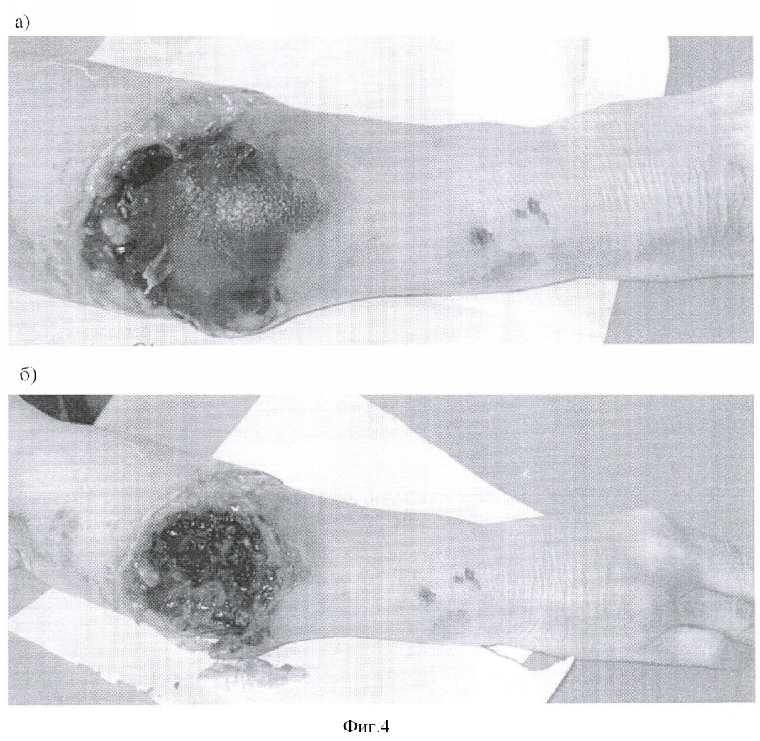 На фиг.4 представлены: а) вид раны при поступлении, б) вид раны после некрэктомии.