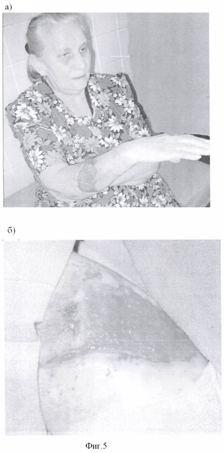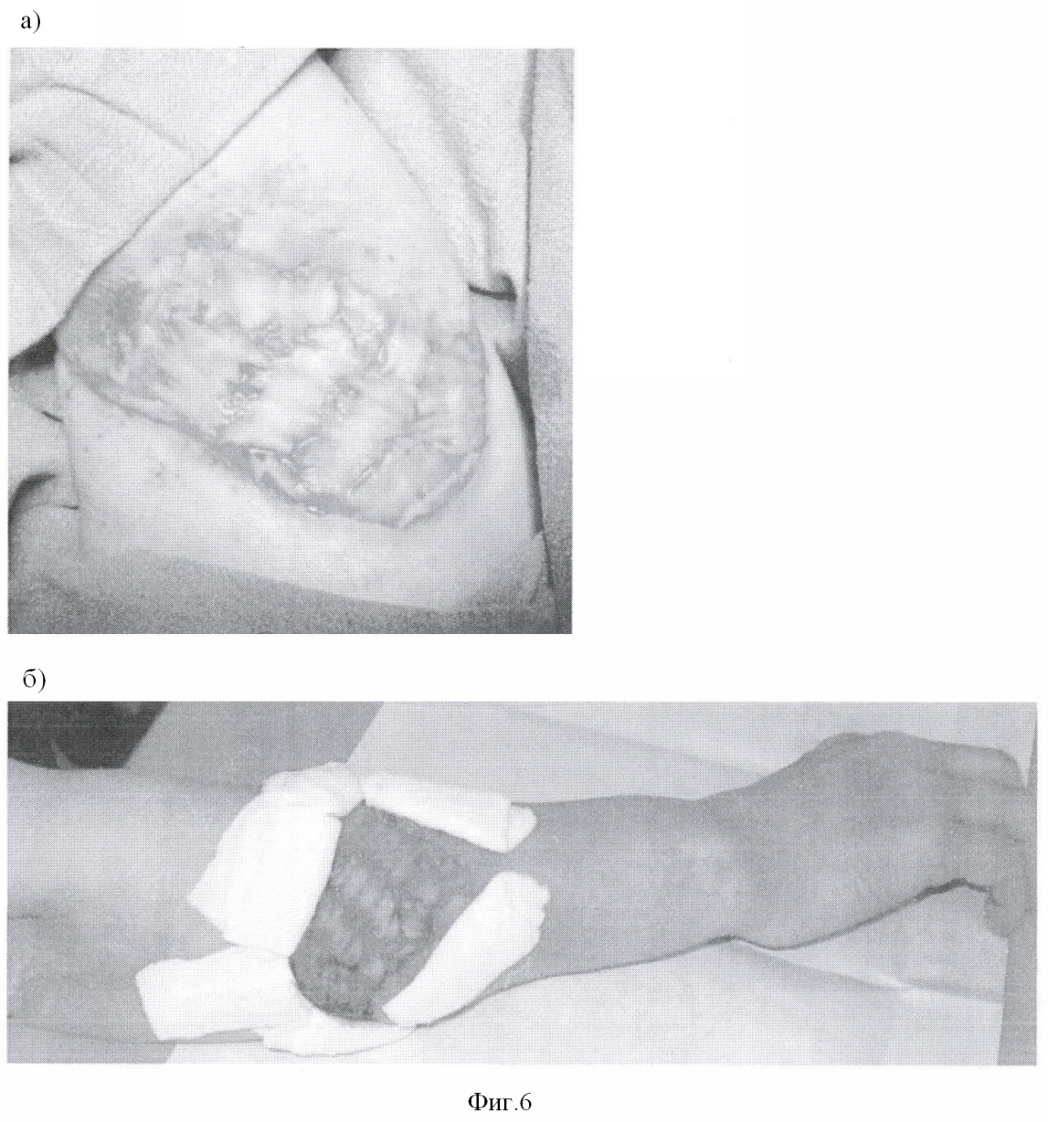 На фиг.5 представлены: а) вид предплечья на фоне лечения ФАП, перед операцией, б) вид раны перед операцией после курса лечения ФАП.