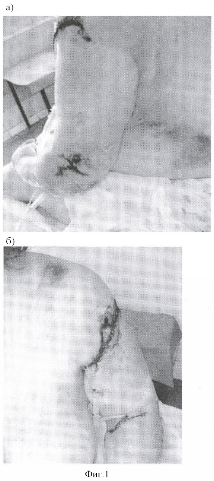На фиг.1 представлены: а) вид ран со спины в первые сутки после вторичной хирургической обработки на 3-й сутки после травмы, б) вид ран спереди в первые сутки после вторичной хирургической обработки на 3 сутки после травмы.