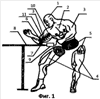 На фиг.1 показано устройство тренажера, который может использоваться в качестве аттракциона, а также в качестве тренажера для тренировки мышц тела за счет их динамического и статического напряжения, где 1 – голова, 2 – торс, 3 – верхняя конечность, 4 – нижняя конечность, 5 – жесткое подвижное соединение элементов 2, 3, 4 между собой, 6 – локтевой сустав, 7 – элемент крепления с поверхностью 8, 9 – датчик, 10 – элемент напряжения, 11 – пружина.