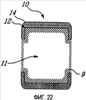 Фиг.7 и 8 показывают детали поперечного сечения канавки 12 и амортизатора 14, показанных на фиг.5 и 6, соответственно. Канавка 12 содержит две поверхности, первую поверхность (или грань) 22, проходящую по существу перпендикулярно большой поверхности 4, и вторую поверхность 23, относительно перпендикулярную малой поверхности 8. Первая и вторая поверхности 22 и 23 соответственно канавки 12 могут пересекаться под углом приблизительно 90° и могут иметь глубину от 0,015 дюйма (приблизительно 0,4 мм) до 0,250 дюйма (приблизительно 6,4 мм) и могут входить в диапазон от 0,025 дюйма (приблизительно 0,6 мм) до 0,060 дюйма (приблизительно 1,5 мм). Как показано на фиг.7, рукоятка 10 хоккейной клюшки показана пустотелой, а именно выполненной из множества тонких стенок, образующих периферию рукоятки. Как показано на чертеже, большая поверхность 4 не доходит вертикально вверх до верха, чтобы быть заподлицо с малой поверхностью 8. Со своей стороны, малая поверхность 8 также не доходит до боковой границы и не доходит до участка, где она была бы заподлицо с большой поверхностью 4. Вместо этого первый компонент 30 полки выступает (т.е. отходит) от конца первой большой поверхности 4, т.е. по существу от большой поверхности 4 и, как показано, по существу перпендикулярно к ней. Компонент 30 полки отходит от стенки рукоятки 10 до своего дистального конца 34. Точно также второй компонент 32 полки выступает (т.е. отходит) от малой поверхности 8 рядом с концом этой поверхности. Подобным образом полка 32 проходит от стенки рукоятки 10 до своего дистального конца 36. Как показано на чертеже, дистальный конец 24 полки 30 встречается с дистальным концом 36 полки 32 с образованием L-образного участка компонента внешней стенки рукоятки 10. Однако понятно, что размеры компонентов 30, 32 полки могут образовать инвертированную L-образную форму или могут иметь по существу одинаковый размер. Как видно на чертеже, геометрия большой поверхности 4, малой поверхности 8, компонентов 30, 32 полки создает углубление (или канавку, или полость) 12 по существу на углу или на кромке рукоятки 10. Понятно, что толщина стенки рукоятки 10 на большой поверхности может быть по существу идентичной толщине компонента 30 полки или, альтернативно, компонент 30 полки может иметь другую толщину. Подобным образом, компонент 32 полки может иметь одинаковую толщину с примыкающей малой поверхностью или может быть другой. Далее, толщина компонента 30 полки и компонента 32 полки может быть одинаковой, или они могут отличаться друг от друга. Понятно, что конфигурация и расположение компонентов 30, 32 полки могут отличаться от показанных на фиг.7, например как показано на фиг.9, 12, 13 и 14. На фиг.7 и 8 показано, что первая поверхность 22 и вторая поверхность 23 имеют разную длину. Однако следует понимать, что первая поверхность 22 и вторая поверхность 23 могут иметь одинаковую длину или, альтернативно, поверхность 23 может быть длиннее, чем поверхность 22.