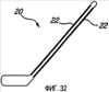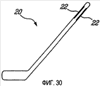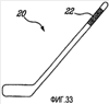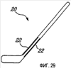 Канавки 12 и амортизаторы 14 могут располагаться в нескольких разных положениях вдоль рукоятки 10 и могут проходить либо по всей длине рукоятки 10, либо лишь по части ее длины. На фиг.28-33 показаны примеры размещения канавок 12 и амортизаторов 14 на хоккейной клюшке 20. Канавка 12 и амортизатор 14 могут располагаться на конкретных участках хоккейной клюшки 20, как показано на фиг.28-31, или вдоль всей длины рукоятки, как показано фиг.32, или размещаться в комбинации. Альтернативно, рукоятка 20 может иметь одну канавку 12 с амортизатором 14 вдоль всей длины рукоятки (как показано на фиг.32) и вторую канавку 12 с двумя амортизаторами 14, разнесенными друг от друга (как показано на фиг.28). Возможно большое количество различных комбинаций, отвечающих любым требованиям. Канавка 12 и амортизатор 14 могут покрывать все поверхности, как показано на фиг.33, и могут проходить вдоль любых частей рукоятки, где требуется повышенная защита от ударов и/или улучшенный захват.
