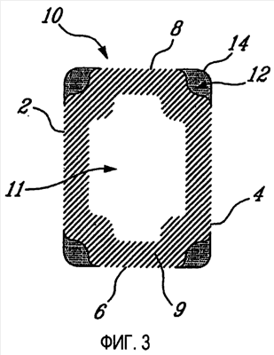 На фиг.1 показан пример сечения известной пустотелой композитной рукоятки 10 хоккейной клюшки, имеющей внутреннее пустое пространство 11. Рукоятка 10 содержит пару противолежащих больших поверхностей 2, 4, разнесенных парой противолежащих малых поверхностей 6, 8, при этом пересечение больших поверхностей 2, 4 и малых поверхностей 6, 8 образует кромку (или угол) 13.