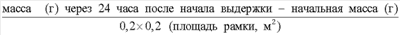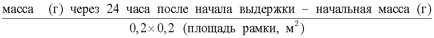 Далее, с использованием керамических облицовочных панелей, имеющих на лицевой поверхности рельефный узор в виде кирпичной кладки, было проведено сравнение качества нанесения между способом согласно изобретению и уже известными способами (разбрызгиванием и наливом). Сначала были приготовлены керамические облицовочные панели, на которые указанными способами было нанесено акриловое эмульсионное покрытие. Затем на лицевую поверхность каждой панели при тех же исходных условиях еще раз нанесли акриловое эмульсионное покрытие, и после его сушки получились испытуемые панели с покрытием. Гигроскопичность лицевой поверхности каждой панели была измерена и проведено сравнение результатов измерения. Измерение гигроскопичности производилось способом размещения рамки: на лицевой поверхности панели с покрытием размещалась рамка 0,2×0,2 м, внутрь этой рамки наливалось некоторое количество воды, в таком состоянии панель выдерживалась 24 часа, а затем согласно приведенной ниже формуле вычислялась величина изменения массы панели за время выдержки.