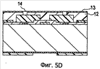 После этого, как показано на фиг.5D, слой 12 фотополимерного покрытия, который образует элемент, формирующий сопло, формируется на позитивном резисте 10, используя метод нанесения покрытия центрифугированием или т.п. Далее слой 12 фотополимерного покрытия покрывается водоотталкивающим материалом 13 путем ламинирования сухой пленкой или подобным методом. Слой 12 фотополимерного покрытия экспонируется в лучах ультрафиолетового излучения, лучах дальнего ультрафиолетового излучения или т.п., затем проявляется, и в нем формируется рисунок, чтобы сформировать выпускные отверстия 14 для чернил в слое 12 фотополимерного покрытия.