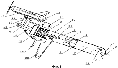 По окончании запусков передние поворотные опоры 20 складывают. Для этого рукоятку 25 фиксатора 24 перемещают назад в направлении, противоположном направлению пуска. При этом подвижный штифт 23 вместе с рукояткой выходит из отверстия сферы 31, опоры 20 разворачивают и они занимают положение вдоль рабочего цилиндра 1. После этого катапульта готова к транспортировке или хранению.
