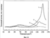 Как видно из фиг.9, в масс-спектре экстракта исходного кристаллического кальция глюконата (кривая 1) имеются высокомолекулярные пики относительно малой интенсивности в области m/z 750-950. В масс-спектре экстракта механоактивированной аморфно-кристаллической композиции аморфного и кристаллического кальция глюконата (кривая 2) относительная интенсивность этих пиков значительно возросла. Еще более высокая интенсивность высокомолекулярных пиков в области m/z 750-950 наблюдается в масс-спектре экстракта механоактивированного аморфного кальция глюконата (кривая 3).