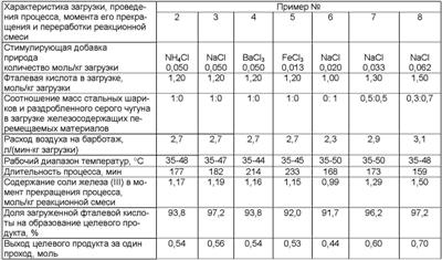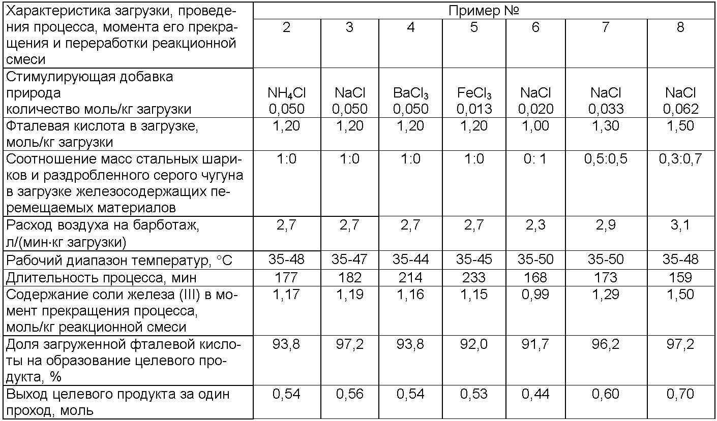 Изобретение относится к усовершенствованному способу получения основного фталата железа (III), который используется в химической практике, аналитическом контроле и в научных исследованиях, путем непосредственного взаимодействия железа с кислородом воздуха и фталевой кислотой в присутствии органического растворителя, где в качестве стимулирующей добавки используют соляную кислоту и неорганические хлориды в количестве 0,013-0,062 моль/кг загрузки, растворителем жидкой фазы берут н-бутиловый спирт, в качестве измельченного и перемещаемого в зоне реакции железа – стальные шарики диаметром 2,2-3,7 мм самостоятельно или же совместно с раздробленным чугуном в любом массовом соотношении между собой, начальное содержание фталевой кислоты варьируют в диапазоне 1,0-1,5 моль/кг загрузки, в качестве реактора используют бисерную мельницу вертикального типа с перетирающим агентом в виде стальных шариков и раздробленного сплава железа совместно со стеклянным бисером в массовом соотношении железосодержащего реагента, бисера и остальной загрузки 1:1:0,6 со сливным патрубком в качестве барботера по ходу процесса, загрузку проводят в последовательности: перетирающий агент и перемещаемый металл, растворитель жидкой фазы, фталевая кислота, хлорсодержащая стимулирующая добавка, а сам процесс начинают с подогрева содержимого реактора до 35°С и ведут при саморазогреве в диапазоне 35-50°С в условиях непрерывного перемешивания, барботажа воздуха с расходом 2,3-3,1 л/(мин·кг загрузки), сдерживания температуры охлаждающей жидкостной баней и контроля за ходом процесса методом отбора проб до практически полного расходования всей загруженной кислоты, после чего барботаж воздуха прекращают, дают возможность суспензии реакционной смеси самотеком слиться через находящуюся в поле действия постоянного магнита сетку в приемную емкость вакуум-фильтра, после чего ее фильтруют, осадок промывают растворителем жидкой фазы и направляют на очистку, а первичный фильтрат и промывной растворитель возвращают в повторный процесс. Безотходный способ проводится при низких температурах, в качестве реагентов могут использоваться отходы других производств. Целевые продукты могут быть отделены путем простого фильтрования. 1 з.п. ф-лы, 1 табл.