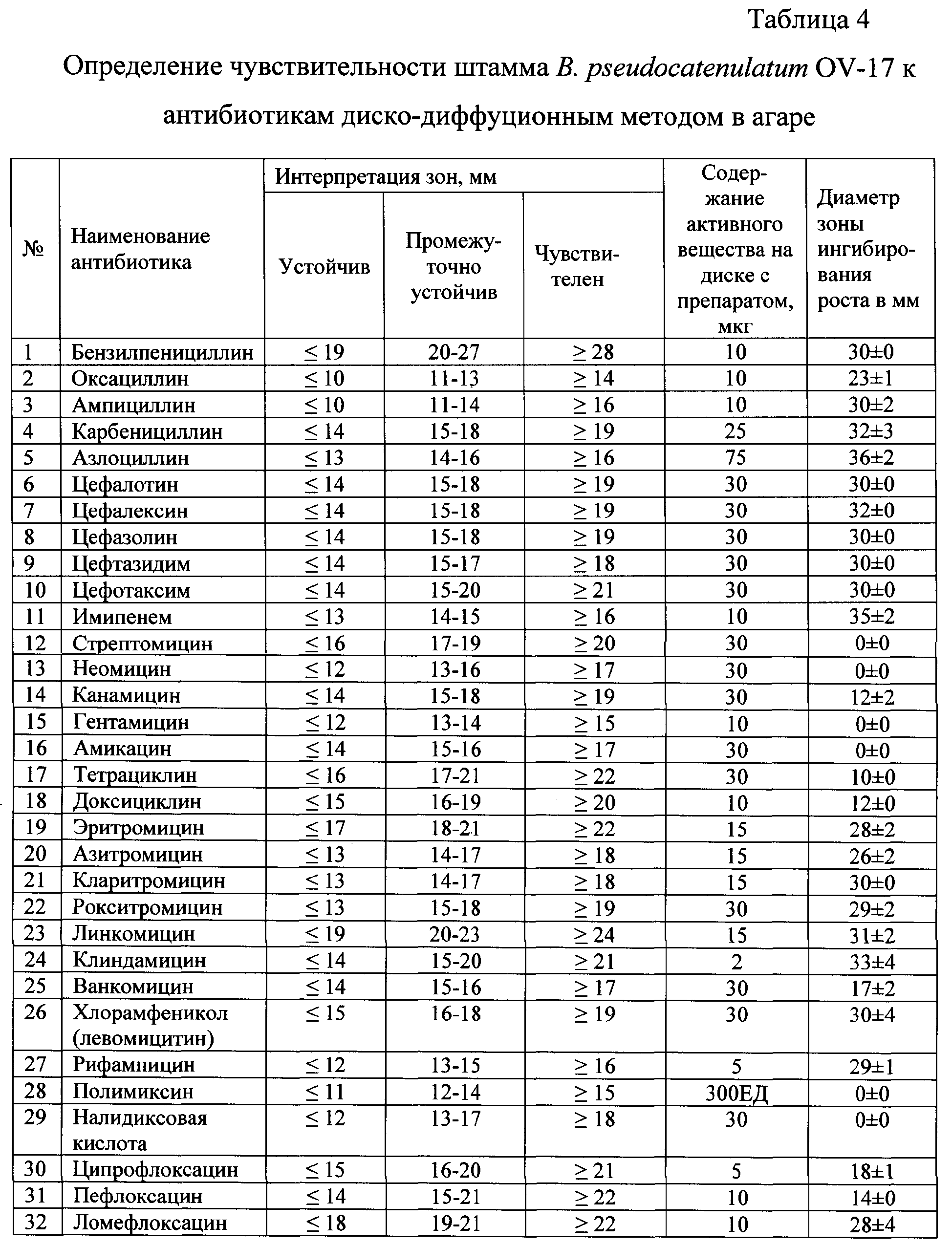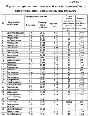 Результаты, представленные в таблице 3, показали, что при нанесении тест-культур на суточную культуру штамма В. pseudocatenulatum OV-17, выращенную на агаризованной среде (метод перпендикулярных штрихов), их рост подавляется. Размер зон задержки роста свидетельствует о том, что штамм В. pseudocatenulatum OV-17 проявляет высокие антагонистические свойства в отношении тестируемых культур. Чувствительность к антибиотикам штамма В. pseudocatenulatum OV-17 изучалась на модели 32 антимикробных препаратов, применяемых в медицинской практике. Изучение проводили диско-диффузионным методом в интерпретации, разработанной в лаборатории биологии бифидобактерий ФГУН МНИИЭМ им. Г.Н.Габричевского с учетом рекомендаций МУК 4.2. 1890-04 [7]. Полученные данные представлены в таблице 4. Как видно из таблицы 4, штамм устойчив к стрептомицину, неомицину, гентамицину, полимиксину, амикацину, налидиксовой кислоте, канамицину, тетрациклину, доксициклину и промежуточно устойчив к пефлоксацину, ванкомицину и ципрофлоксацину. К остальным антибиотикам, используемым в исследовании, штамм чувствителен. Безвредность В опыте изучения острой токсичности штамма В. pseudocatenulatum OV-17 показана его полная безвредность: при введении белым мышам per os микробной взвеси бифидобактерий в количестве 5×107 КОЕ на животное гибели мышей не отмечено. Таким образом, из приведенных данных видно, что новый штамм В. pseudocatenulatum OV-17 отличается высокой технологичностью, при культивировании на производственных средах активно накапливает биомассу бифидобактерий не ниже 109 КОЕ/мл и органические кислоты, обладает высокой антагонистической активностью по отношению к условно-патогенным и патогенным микроорганизмам, устойчивостью к кислой среде и широкому спектру антибиотиков. Безвреден при введении лабораторным животным. Представленные данные изучения штамма В. pseudocatenulatum OV-17 позволяют сделать заключение об его перспективности при использовании как основы для бактерийных препаратов, биологически активных добавок к пище, неферментированных пищевых продуктов, а также средств гигиенического и косметического назначения. Пример 1. Использование штамма В. pseudocatenulatum OV-17 для получения биологически активной добавки к пище в жидком виде. 1-й пассаж: лиофилизированную стартерную культуру штамма В. pseudocatenulatum OV-17 регидратируют средой для культивирования либо физиологическим раствором в 1 мл и титруют методом десятикратных разведений в питательной среде до 107-8 раз. Инкубируют при температуре 37-38°С в течение 48 часов. 2-й пассаж: выросшую культуру из разведения в 106-8 раз в объеме 5% вводят в среду накопления (1 л) и культивируют 16-24 часа при 37-38°С (лабораторная закваска). 3-й пассаж: лабораторную закваску вносят в среду накопления (20 литров) в объеме 5% и инкубируют при 37-38°С (производственная закваска). 4-й пассаж: производственную закваску вносят в объеме 3-5% в аппарат для культивирования со стерильной гидролизатно-молочной средой следующего состава (в расчете на 1 литр среды): гидролизат молока – 0,5 л, пептон – 2 г, лактоза – 10 г, хлористый натрий – 5 г, цистеин – 0,2 г, агар-агар – 1 г, дистиллированная вода – 0,5 литра; рН среды – 7,0-7,2. Проводят культивирование в течение 16-24 часов при температуре 37-38°С. Выросшая биомасса представляет собой жидкий концентрат бифидобактерий с содержанием бифидобактерий не менее 109 КОЕ/мл, который можно непосредств