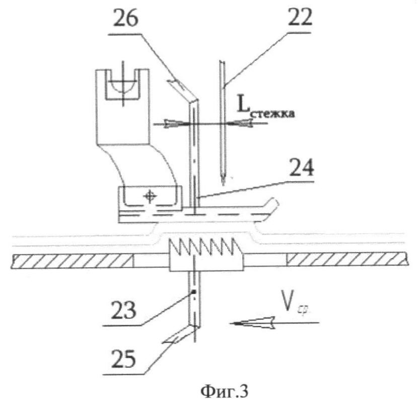 На прижимной лапке и игольной пластинке швейной машины за иглой 22 (фиг.3) установлены при помощи шарнирно-резьбовых соединений сопла подачи и отсоса 23 и 24 соответственно, соединенные с трубопроводами 25 и 26 нагнетающей и всасывающей линий.
