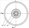 Первый барабан 8 и второй барабан 9 (фиг.3, фиг.4 и фиг.5) состоят из блока 18 с гнездами 19 под сборки 20, подпружиненных шпор цилиндрической формы с роликами 21, неподвижного кулачкового валика 22 или 23 (фиг.3 и фиг.5) и стальной трубы 24 диаметра 1400 1900 мм с отверстиями под подвижные шпоры 10 круглой формы. Диаметр стальной трубы 1400 1900 мм отвечает требованиям к монтажу по длине подвижных шпор 10. Барабаны 8 и 9 установлены на раме 2 таким образом, что каждая из шпор 10 второго барабана 9 при его вращении попадает со смещением по диагонали в среднюю часть расстояния между шпорами 10 в ряду первого барабана 8, а каждый ряд шпор 10 второго барабана 9 попадает в среднюю часть между рядами шпор 10 первого барабана 8. Каждому кулачку 25 кулачкового валика 22 или 23 (фиг.3 и фиг.5) первого барабана 8 или второго барабана 9 придана форма, обеспечивающая плавное вхождение (положение С’) (фиг.3) шпоры 10 в дорожное основание 26 при прокалывании и крутой выход из лунки 27 (положение С) (фиг.3), исключающие выхват прокалываемой массы дорожного основания 26.