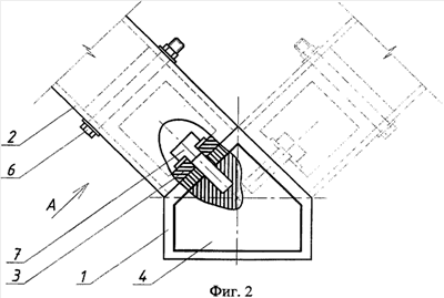 Узел соединения трубчатых профилей трехгранной фермы, изображенной на фиг.1, образован трубчатыми профилями пояса 1 и раскосов 2, соединенных между собой при помощи соединительных элементов 3, и снабжен вставкой 4, установленной в поясе 1 в месте сопряжения с раскосной решеткой, часть которой изображена на фиг.2. Пояс 1 выполнен пятигранной формы сечения, раскосы 2 – прямоугольного коробчатого сечения. Соединительный элемент 3 выполнен из стеклопластика прямоугольного сечения с утолщенной стенкой в основании, со скошенными торцами, как показано на фиг.5, и с поперечными отверстиями 5 в основании под болтовые соединения 6 (фиг.2, 3, 4). Соединительный элемент 3 закреплен на резьбе с помощью болта 7 на наклонной стенке пояса 1 и в установленной в нем вставке 4 пятигранного сечения. Вставка 4 предназначена для усиления пояса 1 в месте соединения с раскосами 2. Она выполнена из стеклопластика либо сплошного сечения, либо полой, с толщиной стенок, достаточной для закрепления болта 7. Во вставке 4 выполнены резьбовые отверстия 8, которые стыкуются с отверстием 9 в каждом соединительном элементе 3 и с отверстиями 10 в наклонной стенке пояса 1. Отверстия 10 в наклонной стенке пояса 1 выполнены с резьбой для более надежного закрепления соединительного элемента 3.