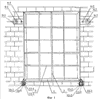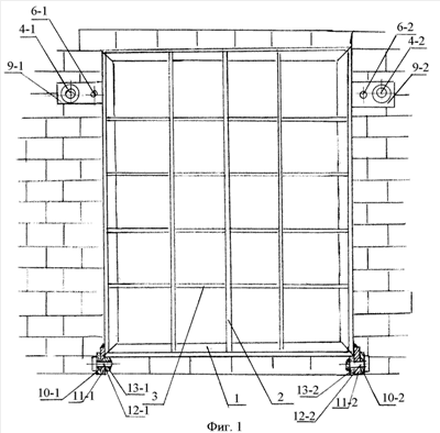 В нижней части рамы 1 расположены петли, причем одни полупетли 11-1÷11-2 приварены к раме 1, а вторые 10-1÷10-2 замоноличены в стену. Полупетли скреплены неразъемно с помощью осей 12-1÷12-2 и шайб 13-1÷13-2 сваркой, а рама 1 имеет возможность поворачиваться вниз.
