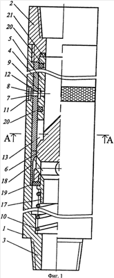 Перед проведением подъемной операции подачу промывочной жидкости останавливают и пружиной 10 перемещают плунжер из нижнего положения в верхнее. Уплотняющие кольца 20 и 21 уплотняют зазоры в смежных элементах конструкции и выполняют определенную амортизирующую функцию. В зависимости от свойств горных пород из набора втулок 18 устанавливают наиболее эффективную за формой или материалом втулки.
