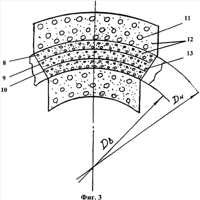 Алмазная буровая коронка состоит из корпуса 1, алмазосодержащей матрицы 2 с торцевым импрегнированным слоем 3, с подрезным наружным слоем 4 и подрезным внутренним слоем 5, разделенной промывочными каналами 6 на рабочие сектора 7, разбитые на три участка одинаковой ширины – участок 8, прилегающий к наружному диаметру коронки Дн, участок 9, прилегающий к среднему диаметру коронки, и участок 10, прилегающей к внутреннему диаметру коронки Дв. В подрезном наружном слое 4 и подрезном внутреннем слое 5 расположены алмазы большого размера 11 и меньшего размера 12, а в торцовом импрегнированном слое 3 расположены алмазы большого размера 13 и алмазы меньшего размера 12.