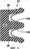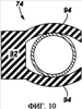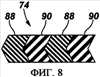 На фиг.8 в общем представлен уплотняющий элемент 74 в виде V-образного пакета сальниковых или шевронных уплотнений. Пакет шевронных уплотнений содержит группы многокомпонентных уплотнений, имеющих большое количество уплотняющих выступов, которые активируют перепад давлений. Эти типы уплотнений применяют в разнообразных случаях использования нисходящих скважин, при этом они пригодны для их применения в качестве внутреннего динамического уплотнения. В представленном варианте конструкции пакет уплотнений содержит группы 88 и 90 уплотнений, образованные соответственно из более мягкого и относительно более твердого полимерных материалов. Например, группы 88 и 90 уплотнений могут формировать пакет уплотнений из чередующихся более мягкого и более твердого полимерных материалов. В этом примере группы 88 уплотнений образованы из модифицированных эластомерных материалов с нанонаполнителем, а группы 90 уплотнений образованы из модифицированных термопластичных материалов с нанонаполнителем.