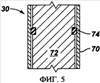 На фиг.5 представлен еще один вариант осуществления скважинного инструмента 30. Скважинный инструмент может представлять собой, например, клапан, такой как предохранительный клапан, или скользящую муфту. В любом случае скважинный инструмент 30 содержит корпус 70, имеющий внутренний элемент 72, например ползун или клапанный элемент, который перемещается относительно корпуса 70. Между корпусом 70 и внутренним элементом 72 образовано уплотнение в виде уплотняющего элемента 74, расположенного в желаемой зоне обеспечения уплотнения. Уплотняющий элемент 74 образован из модифицированного полимера с наполнителем, чтобы улучшить свойства материала уплотняющего элемента 74 и таким образом увеличить долговечность и/или улучшить функциональность скважинного инструмента 30. Характерная форма уплотняющего элемента 74, используемого в данном инструменте 30, может значительно изменяться в зависимости от таких факторов, как выполняемая инструментом функция, тип инструмента или среда, в которой должен действовать скважинный инструмент. Примеры различных уплотнений, которые могут быть использованы в скважинных инструментах, представлены и описаны со ссылкой на фиг.6-11.