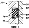 Еще один пример уплотнения представлен на фиг.7. В этом варианте уплотняющий элемент 74 содержит Т-образное уплотнение, в общем имеющее Т-образную центральную часть 84 и пару упрочняющих колец 86. Т-образные уплотнения используют в скважинных инструментах, в которых требуется, например, обеспечение двунаправленного динамического уплотняющего действия между компонентами, совершающими относительное возвратно-поступательное движение. В зависимости от применения Т-образное уплотнение может быть изготовлено из модифицированных термопластиков с нанонаполнителем, из модифицированных эластомеров с нанонаполнителем или из сочетания двух типов полимеров.