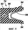 Дополнительные примеры модифицированных полимерных уплотнений с нанонаполнителем представлены на фиг.9-11. В каждом из этих примеров уплотняющий элемент 74 содержит активируемое пружиной уплотнение, образованное в виде однонаправленного статического или динамического уплотнения. Например, согласно фиг.9 уплотняющий элемент 74 содержит тело 92 уплотнения с уплотняющими поверхностями 94 и углубленную внутреннюю часть 96. U-образная пружина 98 расположена в углубленной внутренней части 96, чтобы обеспечивать принудительную подачу уплотняющих поверхностей 94 в наружном направлении.