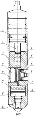 На поверхности с помощью хомута зажимают опорный 8 и инструментальный 5 поршни. Вращением винта 16 возвращают поршень 15 маслосборника 13 в исходное верхнее положение. При этом рабочая жидкость поступает через дроссельное отверстие 14 в камеру 4 мультипликатора и возвращает шток 3 и поршень 2 в исходное положение.