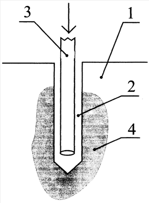 Жидкие ПАВ, взаимодействуя с поверхностями крупных трещин и макропор, образованных после контакта газообразных агентов с микротрещинами и порами среды, значительно снижают свободную энергию на их поверхности, приводя к дальнейшему разупрочнению ослабляемой пористой среды. Образуется зона 4 разупрочненной пористой среды.