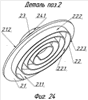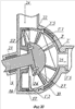 Подгруппа 2.2 – концептуальная модель конструкции и кинематических связей плоского обоюдно шнекового блока подвижных рабочих камер с единым направлением потока и равной длиной рабочего цикла, с прижимным устройством, с преобразующим приводом и с неподвижным и подвижным шнеками. В данной подгруппе спиральные стенки соответствуют спиральным стенкам подгруппы 1.2. Фиг.20 – основной вид. Фиг.19 – вид А с фиг.20. Фиг.21 – разрез Б с фигуры 20. Фиг.22 – разрез В с фиг.19. Фиг.23 – аксонометрический вид подвижного плоского шнека с перемычками и кольцевым диском данной подгруппы. Фиг.24 – аксонометрический вид подвижного плоского шнека с перемычкой и кольцевым диском данной подгруппы.