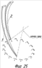 Группа 3 включает фиг.25 и фиг.26 и является рисунками, характеризующими рабочее движение обоюдно шнекового блока посредством траектории движения точек одного сферического шнека относительно другого сферического шнека. Амплитуда колебания, т.е. ширина предполагаемого спирального желоба взята произвольно. Для удобства траектории показаны под разными (отличными от аксонометрии) углами зрения. Сама траектория представлена шестнадцатью положениями точки, которые получены в результате шестнадцати последовательных положений подвижного сферического шнека относительно неподвижного сферического шнека, имеющих место в одном полном цикле рабочего движения. С целью характеристики изменения дифферента подвижного сферического шнека точки изображены в виде центра системы координат. На фиг.25 изображены сегмент днища подвижного сферического шнека поз.2 с траекторией точки, совпадающей с осью полусферы (ось направления формирования дуги сферической спирали предполагаемой спиральной стенки этого шнека), сегмент днища неподвижного сферического шнека поз.1 и его ось. Для удобства проходное отверстие шнека из рисунка исключено. На фиг.26 изображена траектория точки подвижного шнека на фоне сегмента неподвижного шнека фиг.25, а также траектория второй точки, находящейся на днище подвижного шнека, сегмент которого показан на фиг.25, но удаленной от оси полусферы на угол в сорок пять градусов, и траектория третьей точки того же днища подвижного шнека но удаленной от оси полусферы на угол в девяносто градусов в плоскости, перпендикулярной плоскости, образованной центром сфер первой и второй точками. На рисунке выделены указанием точки днища шнека в одном относительном положении днищ, показанном на фигуре 25.