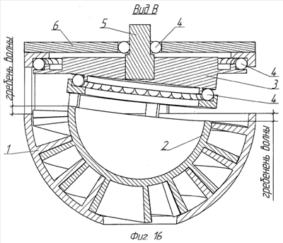 Задача преобразующего привода состоит в преобразовании волнового движения по дуге окружности во вращательное движение. Собственно преобразующий привод состоит из кольцевого диска поз.1.4 неподвижного шнека с повторной поверхностью поз.1.4.1 круглого предельного контура днища подвижного шнека, неподвижно связанной перемычкой поз.1.3 с днищем поз.1.1 неподвижного шнека, кольцевого диска поз.2.4 подвижного шнека с повторной поверхностью поз.2.4.1 круглого предельного контура днища подвижного шнека, неподвижно связанного перемычкой поз.2.3 с днищем поз.2.1 подвижного шнека и вращающейся преобразующей каретки поз.3, зажатой между указанными повторными поверхностями.