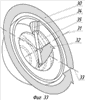 Требования, предъявляемые к оборудованию для изготовления сферических спиральных стенок сферических шнеков, в точности повторяют математическое описание сферических спиралей. Сферическая заготовка должна вращаться по отношению к резцу в двух направлениях, с четко установленным соотношением скоростей этих вращений. При этом режущая кромка режущего инструмента (лучше фреза) является функциями второго порядка. В группе 5 графической части на фиг.32 показан принцип изготовления одного сферического шнека, а на фиг.33 другого сферического шнека. Плоскость поз.30 стрелки показывает направление вращения заготовки вокруг оси поз.31. Плоскость поз.32 стрелки показывает направление движения вращающейся фрезы поз.34 вокруг оси поз.33. Результатом траектории поз.35 движения режущей кромки фрезы будет являться сферическая спиральная стенка. На фиг.34 изображена режущая кромка как образующая второго порядка для фрез фиг 32 и фиг.33.