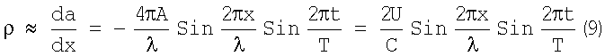 Обратимся теперь к вопросу о распределении давления в стоячей волне. В волне, распространяющейся в направлении сил оси х, давление р пропорционально изменению смещения вдоль х, т.е. величине da/dx. Дифференцируя выражение (7) по х, получим