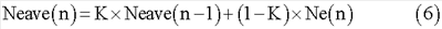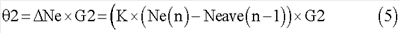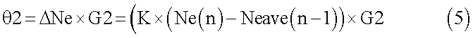 В ходе этапа S22 вычисляется вторая величина 2 задержки (второй индекс изменения целевой выходной мощности). Вторая величина 2 задержки такова, какой она может быть получена посредством умножения отклонения Ne между частотой Ne(n1) вращения двигателя, которая была введена в ходе этапа S12, и частотой Neave(n-1) вращения двигателя, к которой применен расчет задержки первого порядка на Ne прирост G2 преобразования величины задержки, и получен нижеследующим уравнением (5). Следует отметить, что К обозначает весовой коэффициент для расчета задержки первого порядка, и Ne прирост G2 преобразования величины задержки может быть установлен соответственно заранее посредством подтверждения на основании результатов экспериментов и т.п.