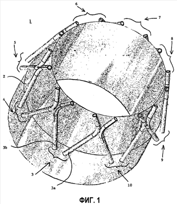 Средства 3-10 возмущения представляют собой пары трубок 3а, 3b, , 10а, 10b, распределенных на наружной стенке кольца 2 и представляющих выходное отверстие на уровне свободной кромки этого кольца 2. В данном случае речь идет лишь о возможной конфигурации. При этом вполне очевидно, что пары трубок также могут быть интегрированы в толщу кольца 2.